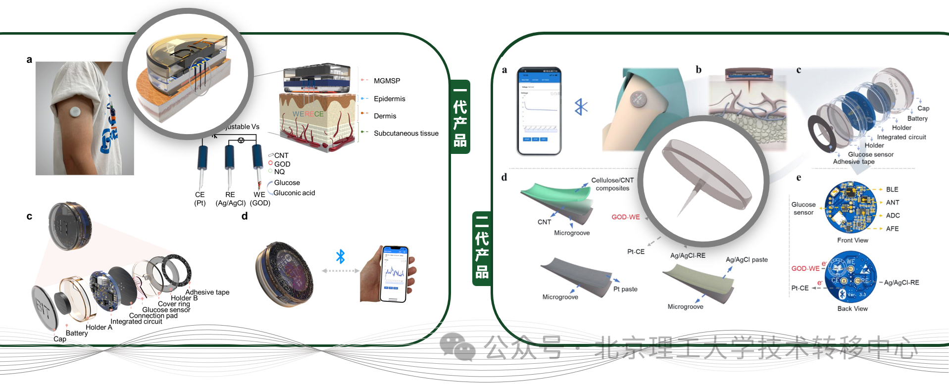 图1.可穿戴血糖监测传感器的两代产品