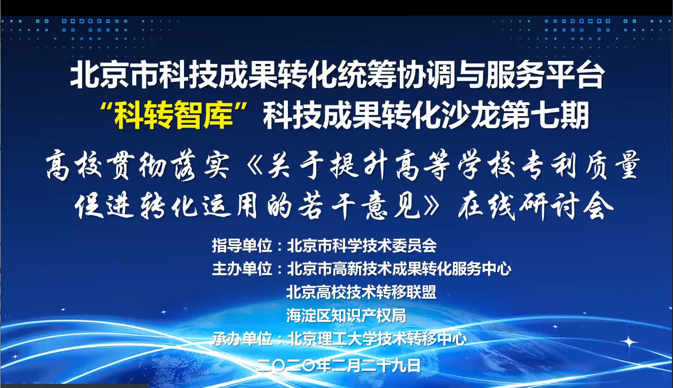 2020年1月1日,《北京市促进科技成果转化条例》(以下简称《条例》)正式实施。日前,教育部、国家知识产权局、科技部发布了《关于提升高等学校专利质量促进转化运用的若干意见》(以下简称《若干意见》)。为进一步加大宣传力度,推动《条例》和《若干意见》在高校院所落地,2月29日,在北京市科委的指导下,北京市高新技术成果转化服务中心、北京高校技术转移联盟、海淀区知识产权局通过互联网平台举办“科转智库”系列沙龙2020年首期活动,就《条例》和《若干意见》开展线上研讨,市科委副主任刘晖通过线上与大家研讨交流。