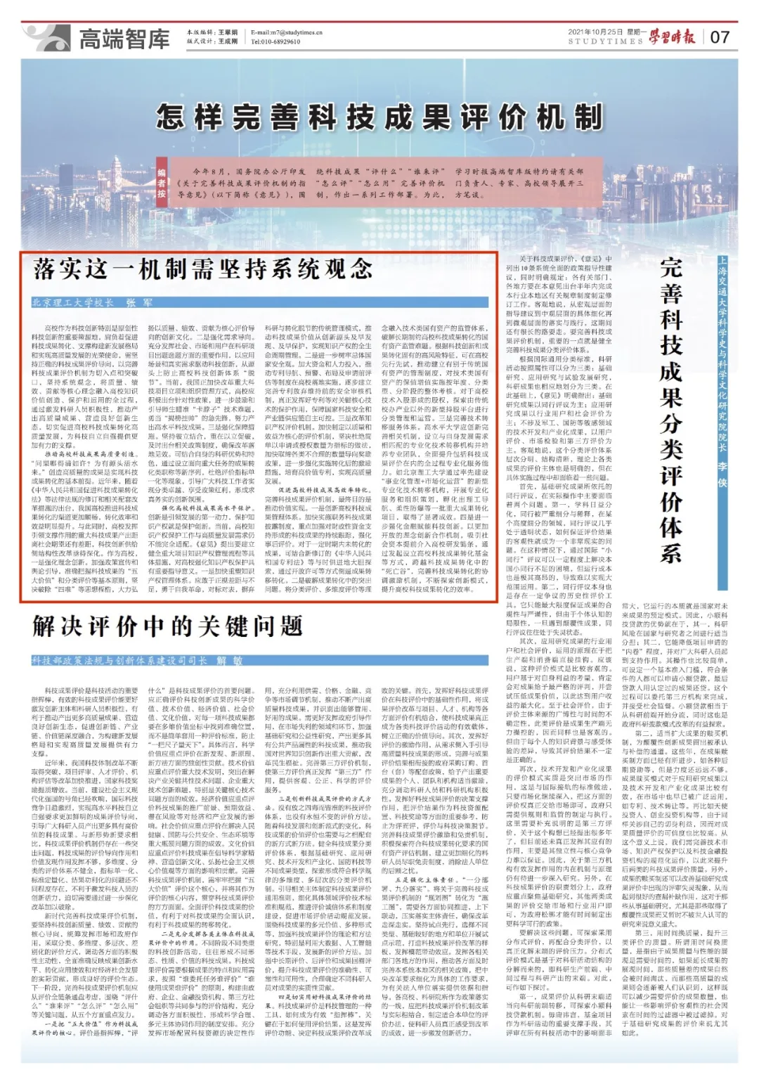 《学习时报》|北京理工大学张军院士:完善科技成果评价机制需坚持系统观念